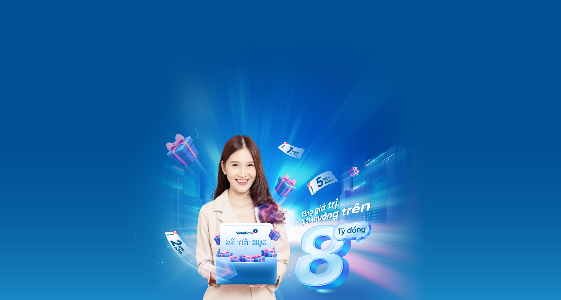 Khách hàng mở mới sổ tiết kiệm (trả lãi sau/trả lãi trước/trả lãi định kỳ) đồng thời sử dụng gói tài khoản thanh toán tại các chi nhánh/phòng giao dịch VietinBank sẽ được nhận quà tặng bằng tiền mặt hoặc hiện vật không giới hạn số lần nhận quà với giá trị quà tặng lên tới 10.000.000 VND/ngày.