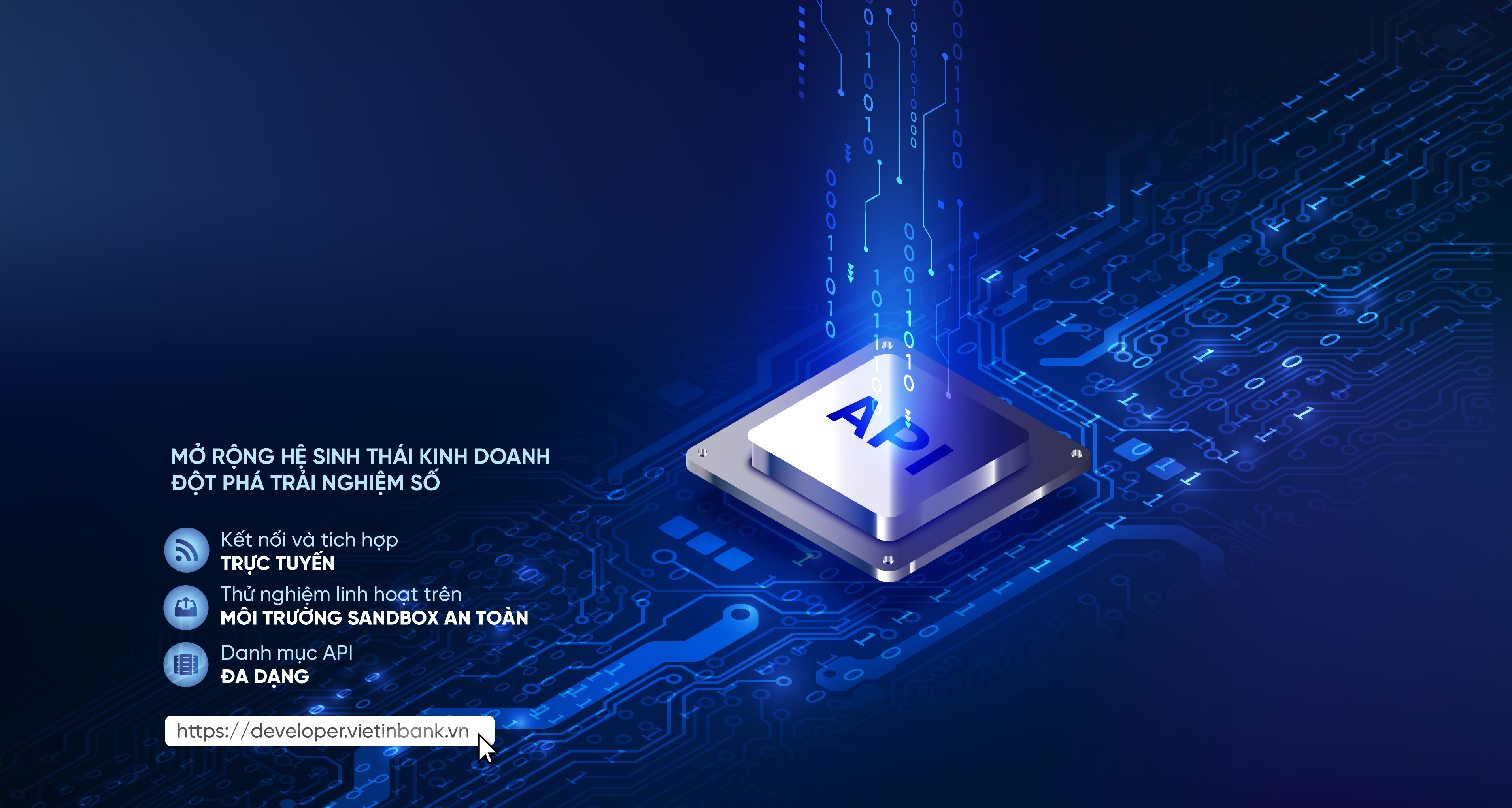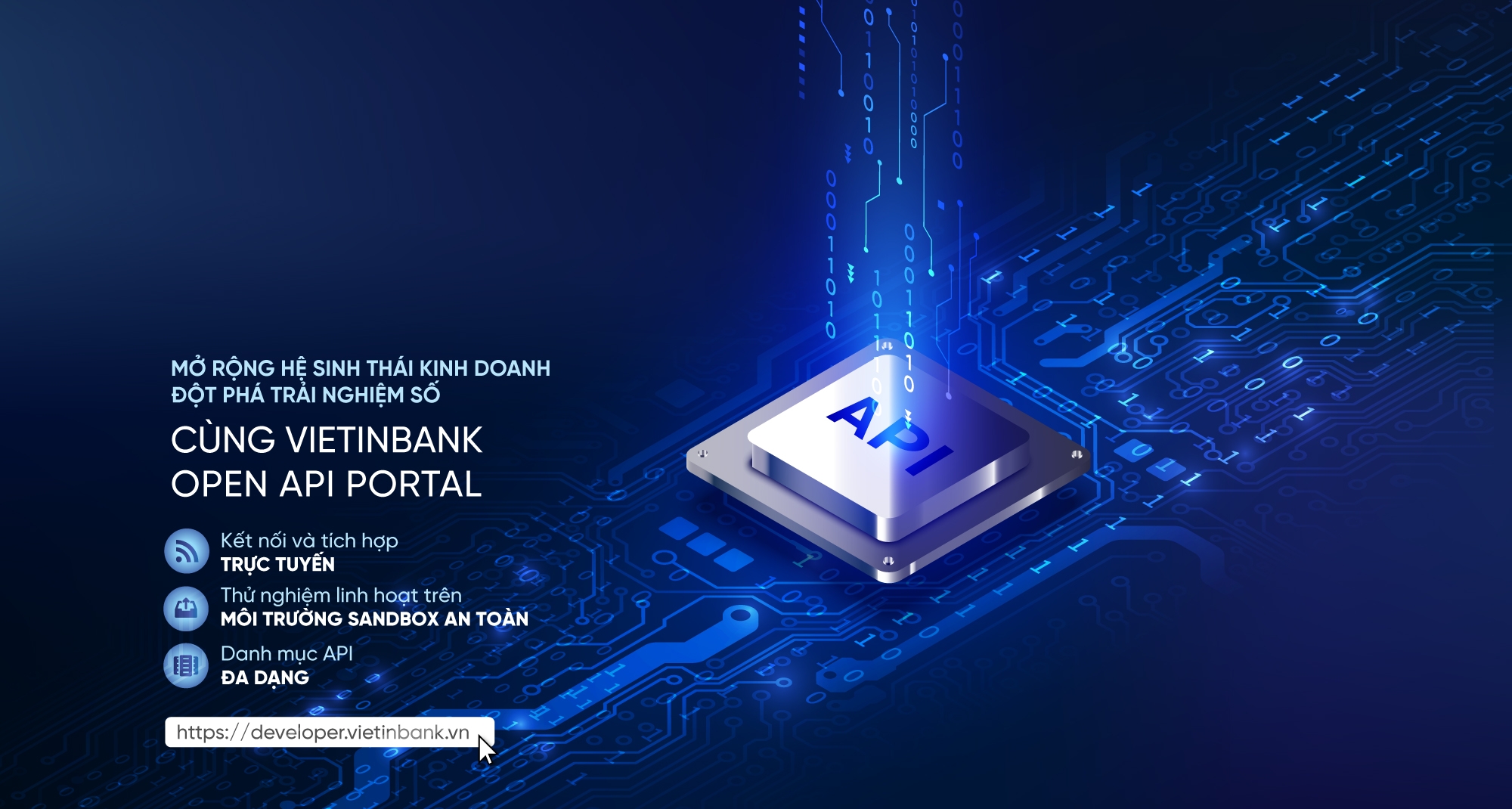 VietinBank Open API Portal là cổng thông tin ngân hàng mở, mang đến cho doanh nghiệp và đối tác công nghệ những trải nghiệm dịch vụ ngân hàng chủ động, hiện đại, đa dạng và tiện ích. Tại đây, doanh nghiệp có thể tự thiết kế các giải pháp tài chính sáng tạo, nâng cao tính linh hoạt và hiệu quả với nền tảng API mở, hỗ trợ doanh nghiệp đón đầu xu thế ngân hàng số và fintech đang bùng nổ.