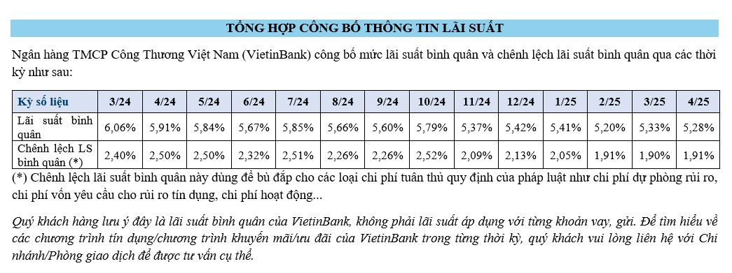 Vietnam Joint Stock Commercial Bank for Industry and Trade (VietinBank) announces the average interest rate and average interest rate margin over the periods as follows: