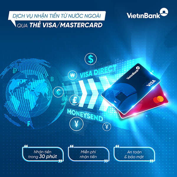 Theo đó, dịch vụ Visa Direct/Moneysend được triển khai kể từ tháng 12/2023, áp dụng cho các loại thẻ Tín dụng Quốc tế, Ghi nợ Quốc tế Visa/MasterCard của VietinBank tại Việt Nam. Dịch vụ cho phép người chủ thẻ Quốc tế Visa, MasterCard của VietinBank tại Việt Nam nhận tiền từ nước ngoài một cách nhanh chóng (tối đa 30 phút) vào mọi thời điểm. Người nhận tiền có thể sử dụng ngay lập tức số tiền nhận được, giúp tiết kiệm thời gian, thủ tục nhận tiền tại quầy giao dịch.